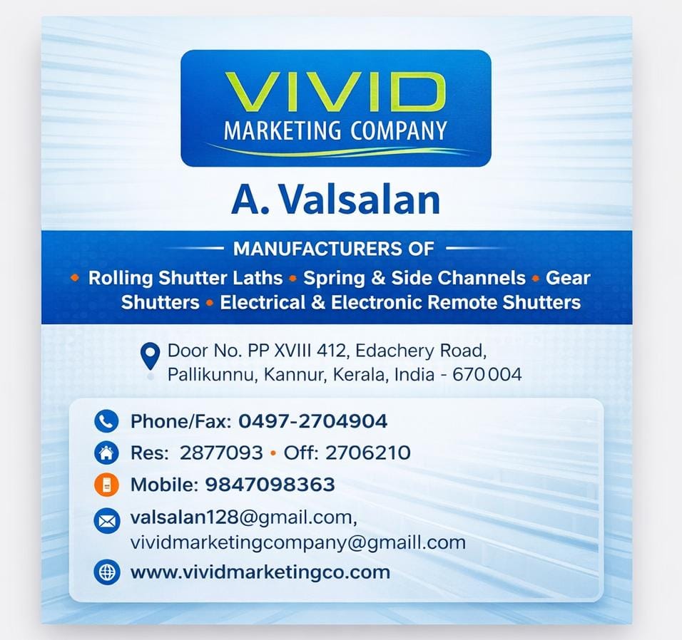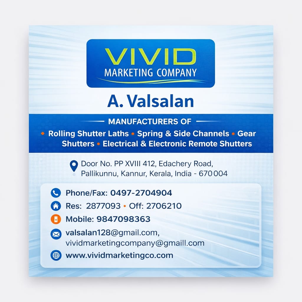 VIVID MARKETING COMPANY IS ONE OF THE LEADING MANUFACTURES IN KANNUR. THEY DEALS WITH ROLLING SHUTTER LATHS, SPRING AND SIDE CHANNELS, GEAR SHUTTERS AND ELECTRICAL&ELECTRONIC REMOTE SHUTTERS